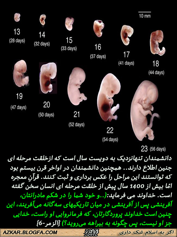 از اکتشافات مهم در علم جنین شناسی، خلقت مرحله ای جنین در شکم مادر است. اما آیا قرآن اشاره ای به آن داشته است؟